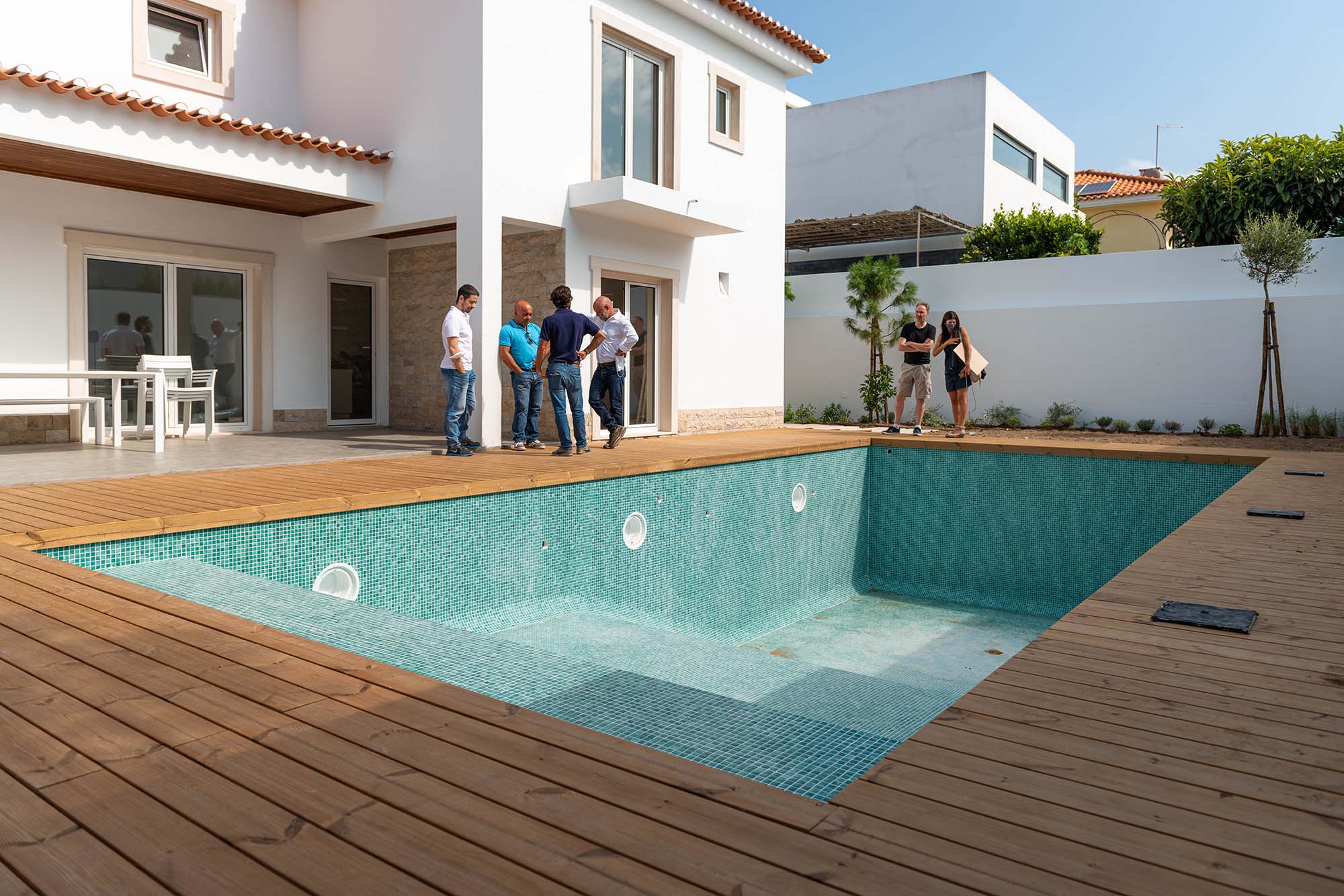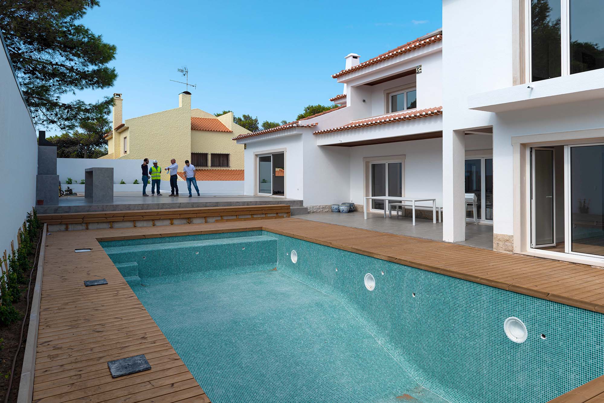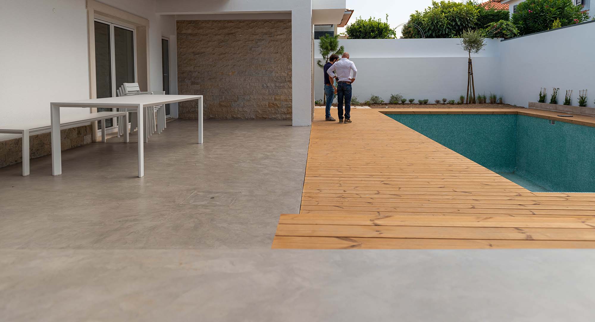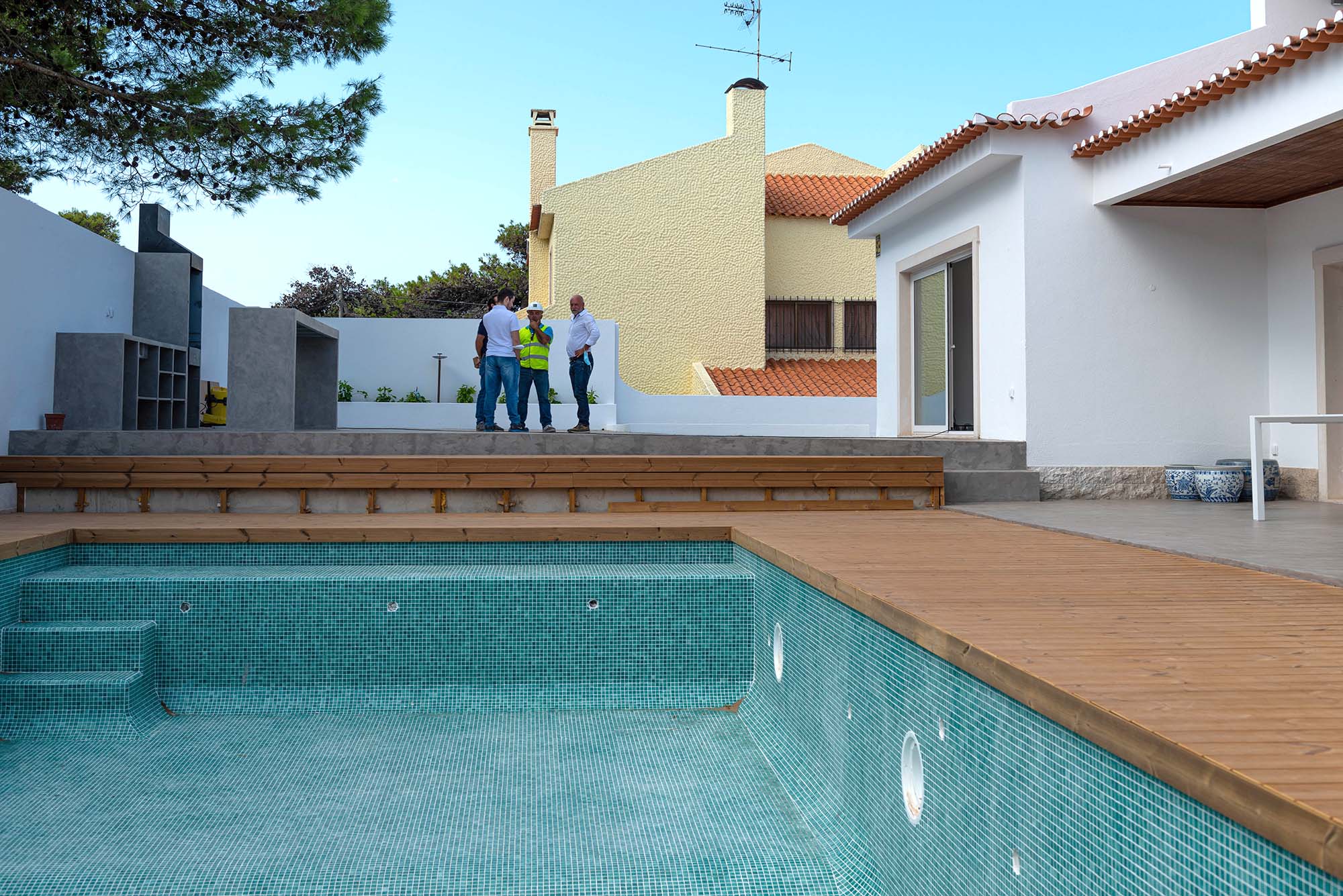 With an ambitious landscaping project, an enviable exterior was achieved, where microcement once again left its mark on a 130m2 patio and terrace, ending in a minimalist bench and barbecue. The 10-metre pool was lined with tiles in greenish tones and surrounded by natural wooden deck pieces. Circulation outside is made through limestone walkways filled with decorative gravel. The plantations are born in a harmonious way and there was also space for a fountain with Roman lines with a system for recirculating the pool water.